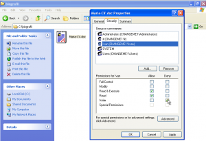 Примерно: Ако обектът е файл, на потребителя Ivan могат да се даде право (Allow) да чете файл C:\biogarifii\Maria-CV.doc и да му се отмеме правото (Deny) да го редактира (фиг. 1).