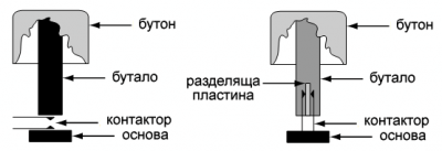 | + | Спрямо вида на бутоните и тяхното разположение има голямо разнообразие от клавиатури. Два основни фактора, които се вземат при изработка: издръжливост и удобство на ползване. Много често нанасяме силни удари при натискане на бутона. На Фиг. е показна примерна реализация на бутони. При левия бутон силата, с която ще се натиснат контакторните пластини зависи от натиска върху бутона. Това ще доведе до по-бързото й износване. В десния случай силата, която се прилага, не се предава директно на контактните пластини. | ||