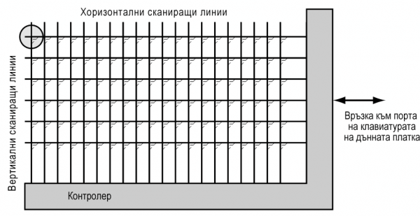 Клавиатурата има несложен интерфейс към компютъра. С всяко натискане или отпускане на бутон се изпраща код от клавиатурата, който съдържа позицията на бутона и състоянието. На Фиг. 2 е показана принципна схема на матрицата на клавиатурата. Всеки ключ уникално свързва двойка проводници съответно по един от хоризонталата и вертикалата. Микропроцесорът (т.н. контролер на клавиатурата) открива кой бутон е натиснат като последователно сканира всяка двойка линии. Контролерът преобразува затварянето на контактора в код подходящ за интерпретиране от компютъра.