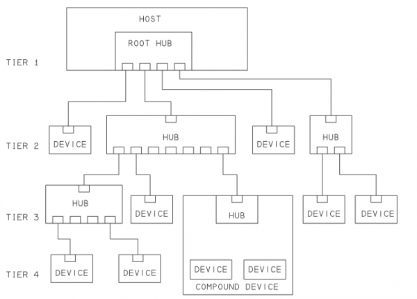 Eдна USB система има само един USB хост. Хостът съдържа контролер и root хъб. Root хъба може да има един илиняколко извода/порта.